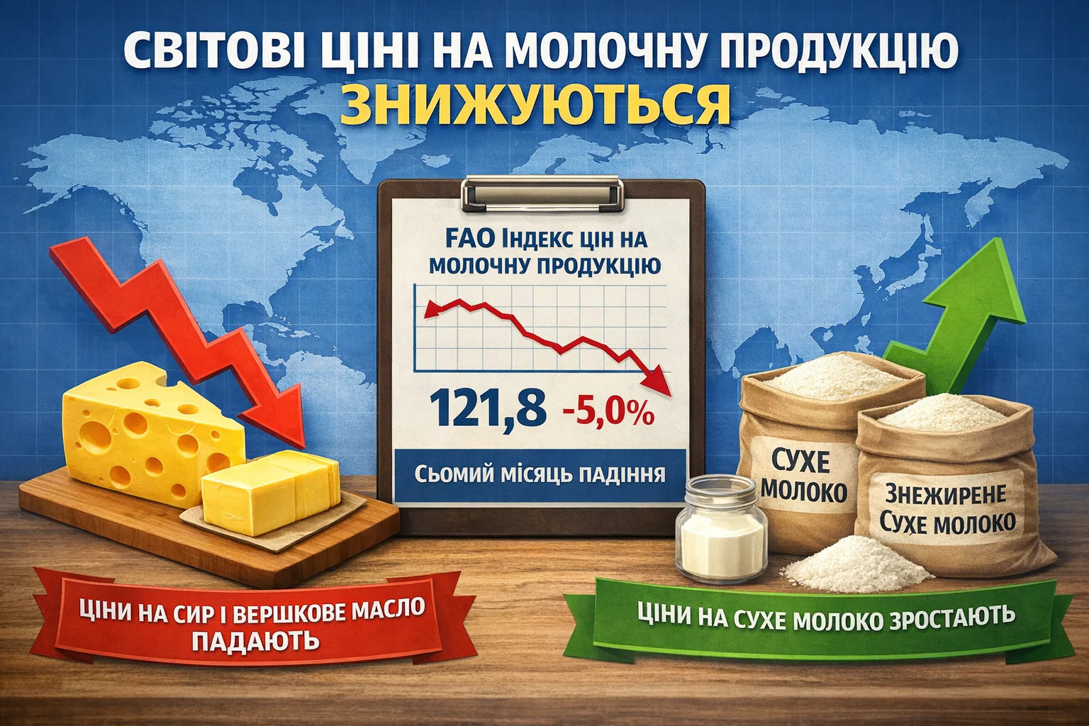 За даними FAO, індекс цін на молочну продукцію FAO у січні в середньому становив 121,8 пункту, що на 5,0% (–6,4