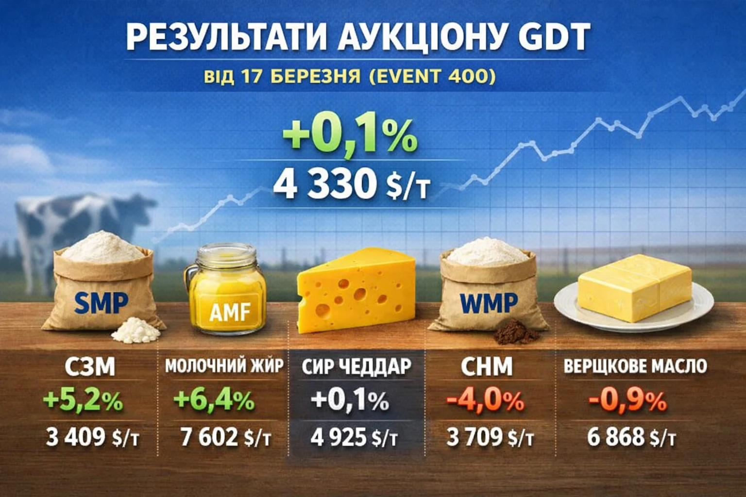 За результатами торгів Global Dairy Trade (GDT) від 17 березня 2026 року індекс цін на молочну продукцію зріс на 0,1%
