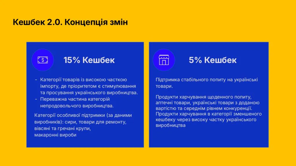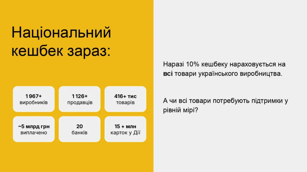 За даними уряду, за півтора року програмою скористалися 4,9 млн українців, а обсяг покупок українських товарів перевищив 63 млрд грн. Модель змінюють без збільшення бюджету — кешбек стає більш адресним.