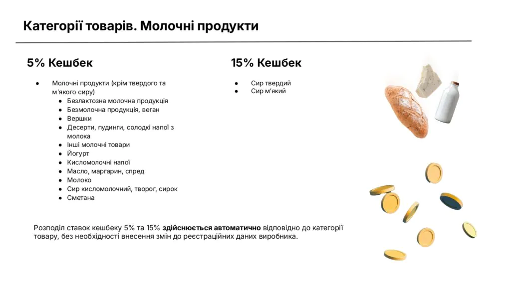 Ключова зміна для молочного ринку — 15% кешбеку для твердих і м’яких сирів українського виробництва. Ці категорії віднесені до сегментів із високою часткою імпорту (понад 35%), де конкуренція для вітчизняних виробників є найжорсткішою. Саме тут держава посилює стимул для споживачів обирати українське.
