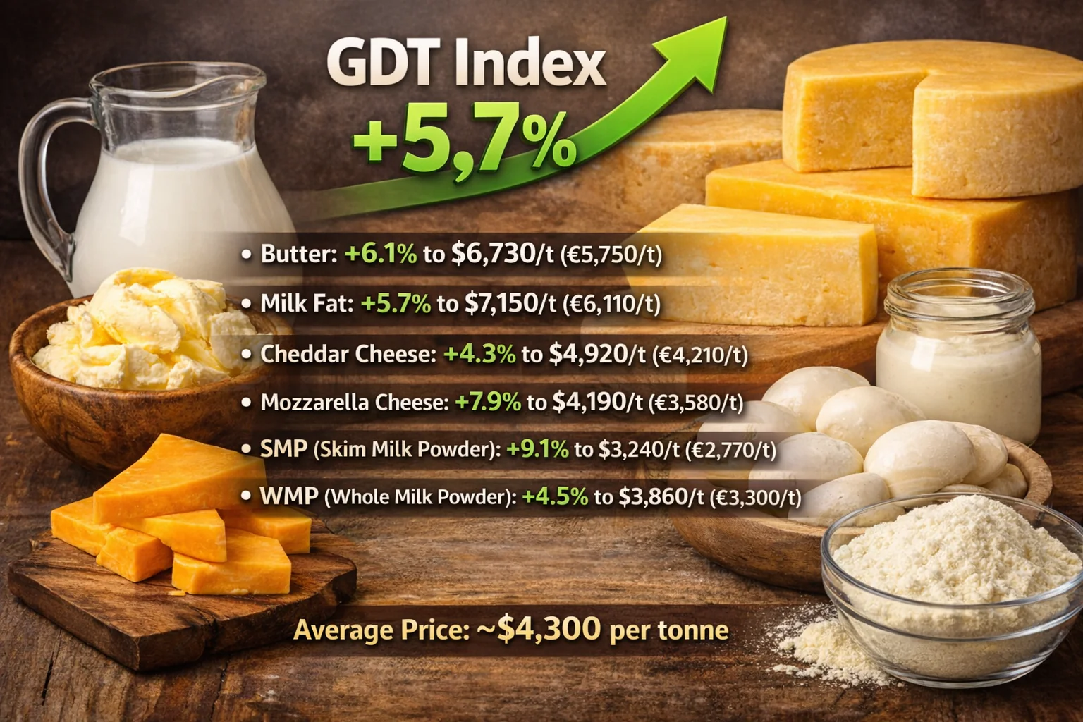 According to the results of Global Dairy Trade Event 399, the overall price index increased by 5.7%, marking the fifth consecutive auction with positive momentum. The average winning price reached approximately $4,300 per tonne.