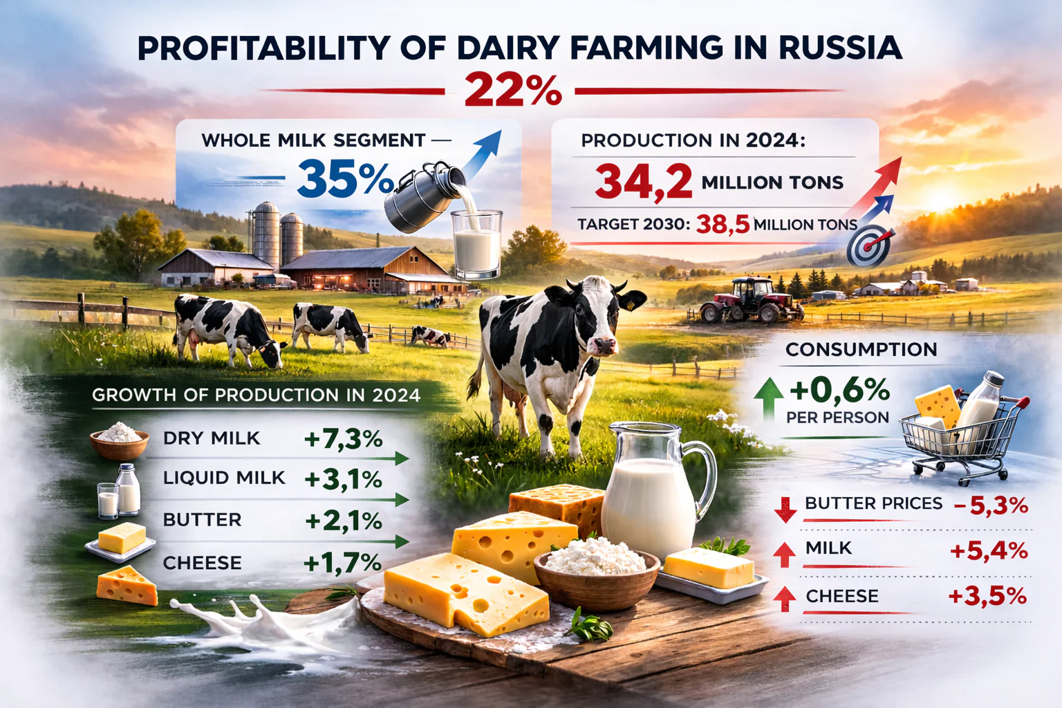 As reported by Interfax.ru, the Ministry of Agriculture of the Russian Federation expects the profitability of the dairy cattle sector to reach 22% by the end of 2025, excluding subsidies, and 35% in the raw milk segment.